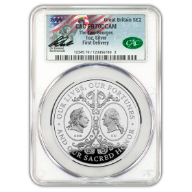 2025 Great Britain 1 oz Silver Two Georges CAC Ron Drzewucki Signature PR70